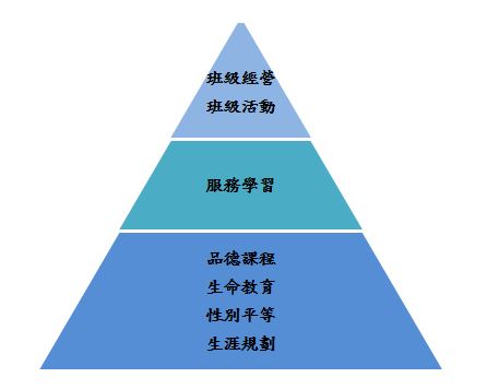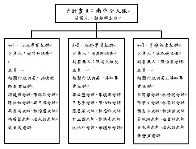 本子計畫包含三個分支計畫,主要是由各召集人與各年級不同的導師群組成教師專業社群。我們期望學生能在課堂上學習到自我品格的要求、人我關係的和諧及與大自然和宇宙的和諧共處。專業學習社群於學期中固定時間聚會研討,結合衛生組、教官室及輔導室的行政支援,由討論議題導入行動研究,擬定並舉辦具目標導向的教學課程。