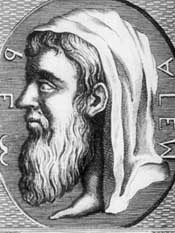 希臘的哲學家和數學家,和他的信徒們組成了一個所謂「畢達哥拉斯學派」的政治和宗教團體。「在一個直角三角形中,兩股的平方和等於斜邊的平方。」這個定理中國人(周朝的商高)和巴比倫人早在畢氏提出前一千年就在使用,但一般人仍將定理歸屬於畢達歌拉斯,是因為他證明了定理的普遍性。此外「畢氏學派」的貢獻尚有:無理數的發現;知道正多面體有五個:正四面體、正六面體、正八面體、正十二面體和正二十面體。 |